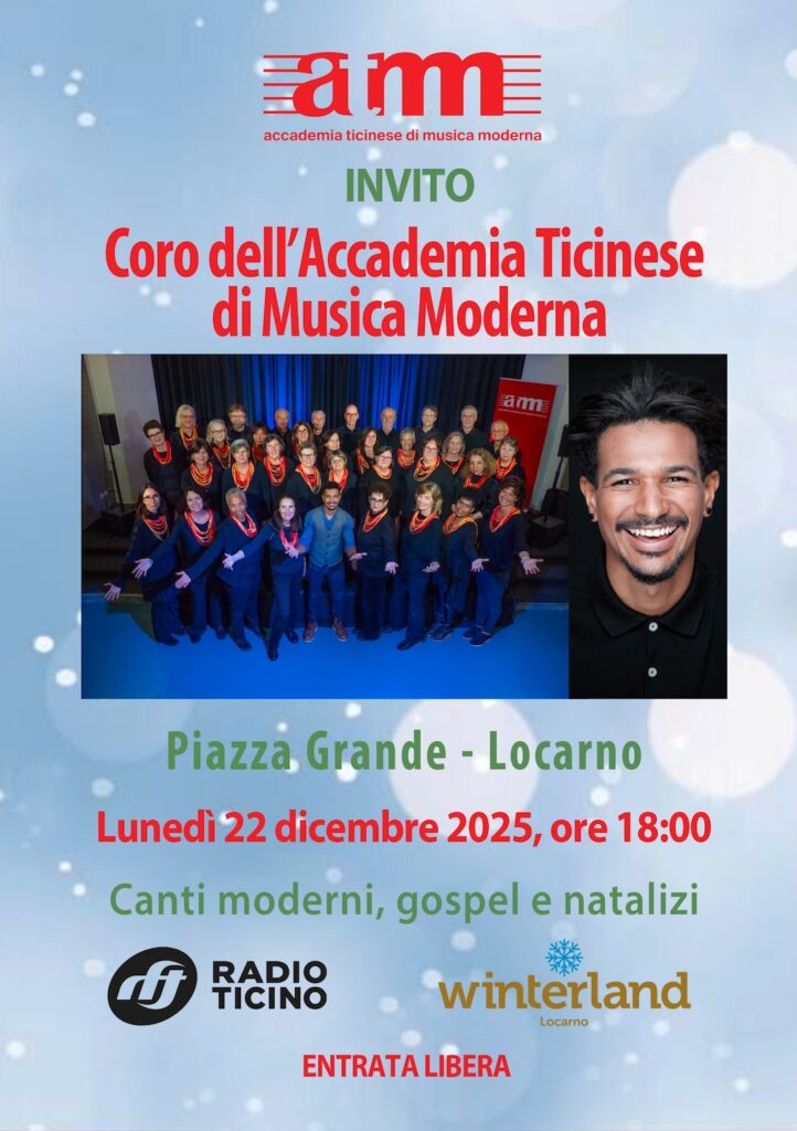 Lunedì 22 dicembre alle ore 18:00 il coro dell’Accademia Ticinese di Musica Moderna terrà l’ultimo concerto nella magica Piazza Grande di Locarno. Grazie all’invito di Winterland il coro proporrà canti moderni, natalizi e Gospel per animare la serata di Locarno. Per l’occasione il coro potrà avvalersi della presenza come solista del cantante professionista Omar Gueye, accompagnato alla batteria da Andrea Varolo, al basso da André Sampaio e al pianoforte da Emilio Pozzi. La direzione del coro, composto da 30 elementi, è affidata a Giovanni Bataloni, rinomato arrangiatore e compositore comasco. L’entrata è libera grazie a Winterland e Radio Ticino. Per informazioni si può contattare l’ATMM allo 091 756 15 40 (www.atmm.ch).