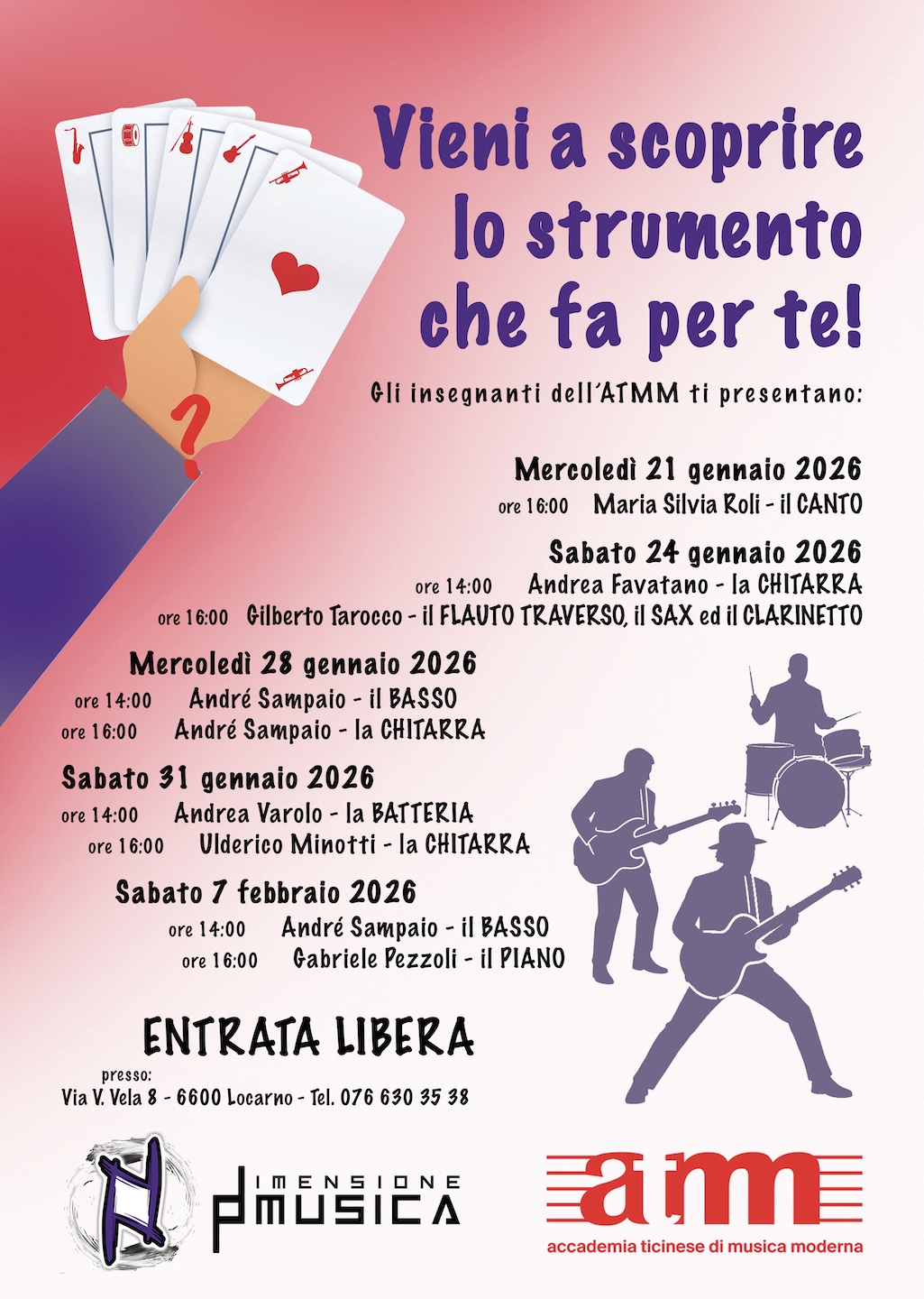Avvicinarsi alla pratica di uno strumento musicale con i docenti dell’Accademia Ticinese di Musica Moderna sarà più facile grazie all’iniziativa promossa da Dimensione Musica di Locarno.